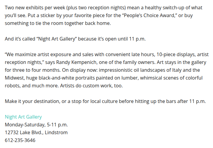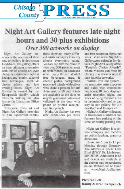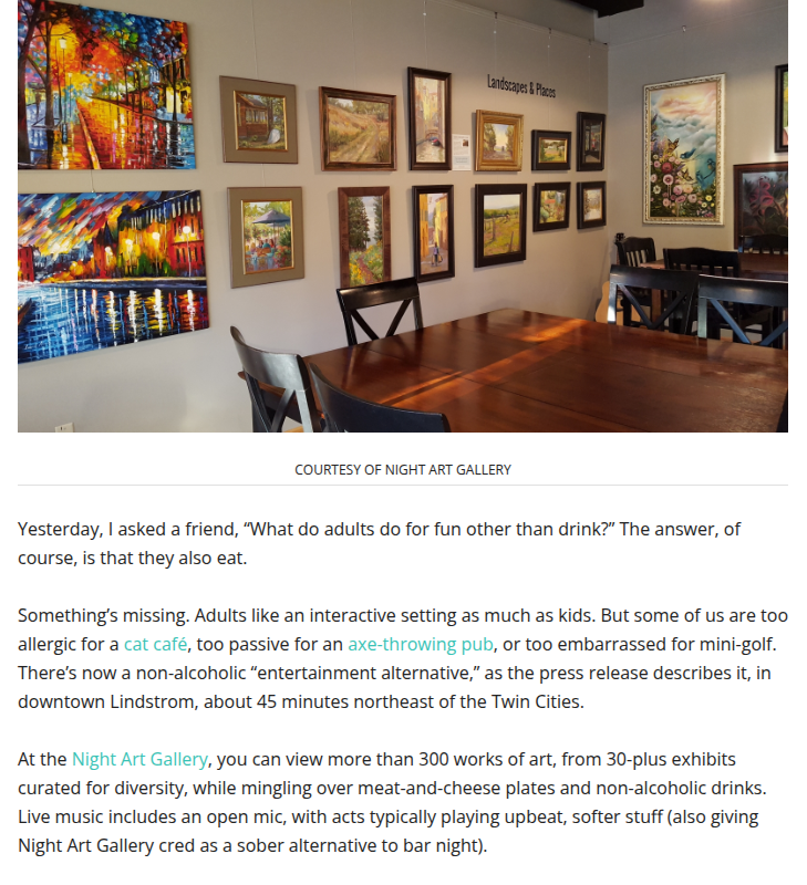 In our Minnesota Monthly article, the Night Art Gallery in downtown Lindstrom is spotlighted as a creative, alcohol-free entertainment option for adults. Open late until 11 p.m., the gallery features over 300 works across 30+ rotating exhibits, offering a lively mix of visual art, live music, and social connection. Visitors can enjoy non-alcoholic drinks, meat-and-cheese plates, and take part in interactive experiences like the “People’s Choice Award.” With new exhibits and receptions weekly, the gallery provides a fresh, engaging atmosphere for those seeking culture without the bar scene. Owned by the Kempenich family, it’s redefining local nightlife.